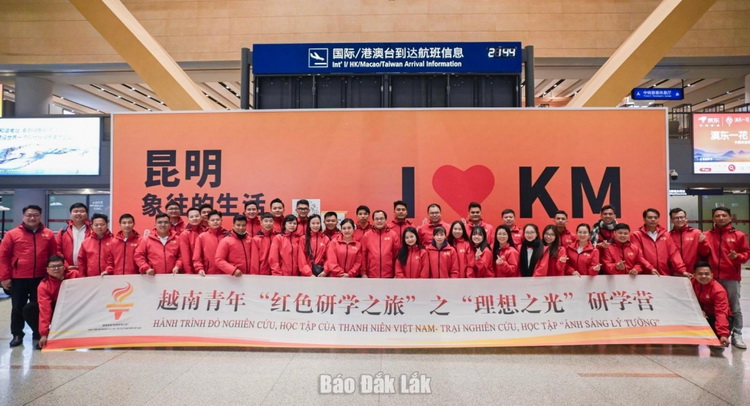 Các đại biểu thanh niên Việt Nam tham gia Hành trình đỏ nghiên cứu, học tập của thanh niên năm 2025 lần thứ 2 tại Trung Quốc xuất phát từ TP. Hồ Chí Minh sang TP.Côn Minh, tỉnh Vân Nam.