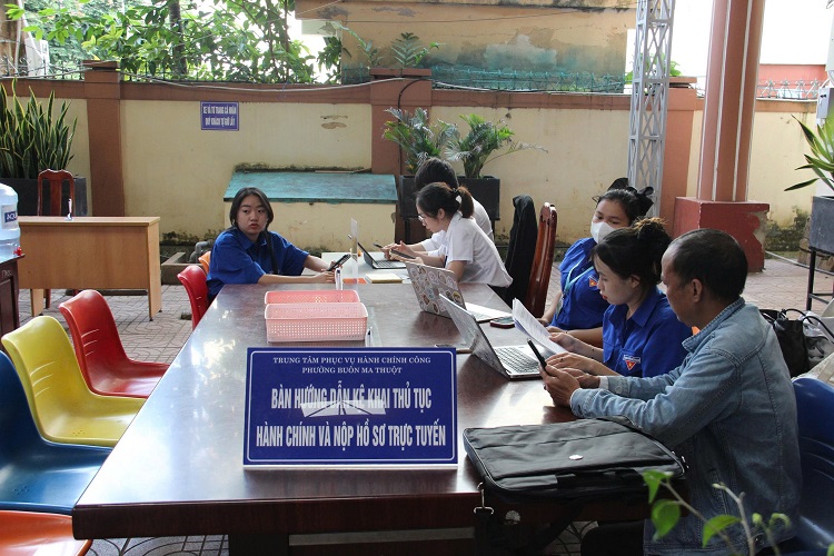 Đoàn thanh niên hướng dẫn người dân nộp thủ tục hành chính trên Cổng dịch vụ công Quốc gia tại Trung tâm Phục vụ hành chính công Phường Buôn Ma Thuột