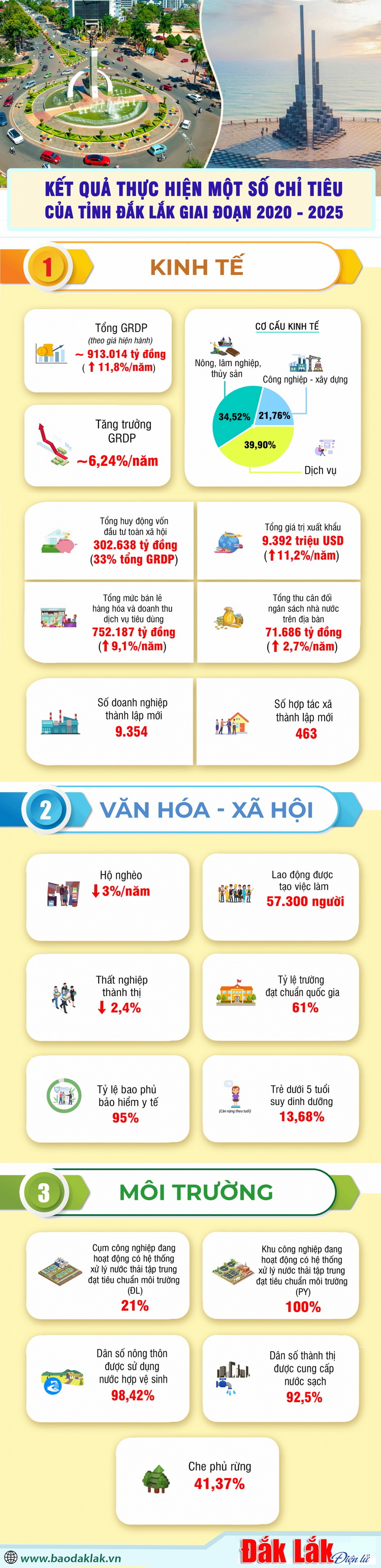 (Infographic) Kết quả thực hiện một số chỉ tiêu của tỉnh Đắk Lắk giai đoạn 2020 - 2025