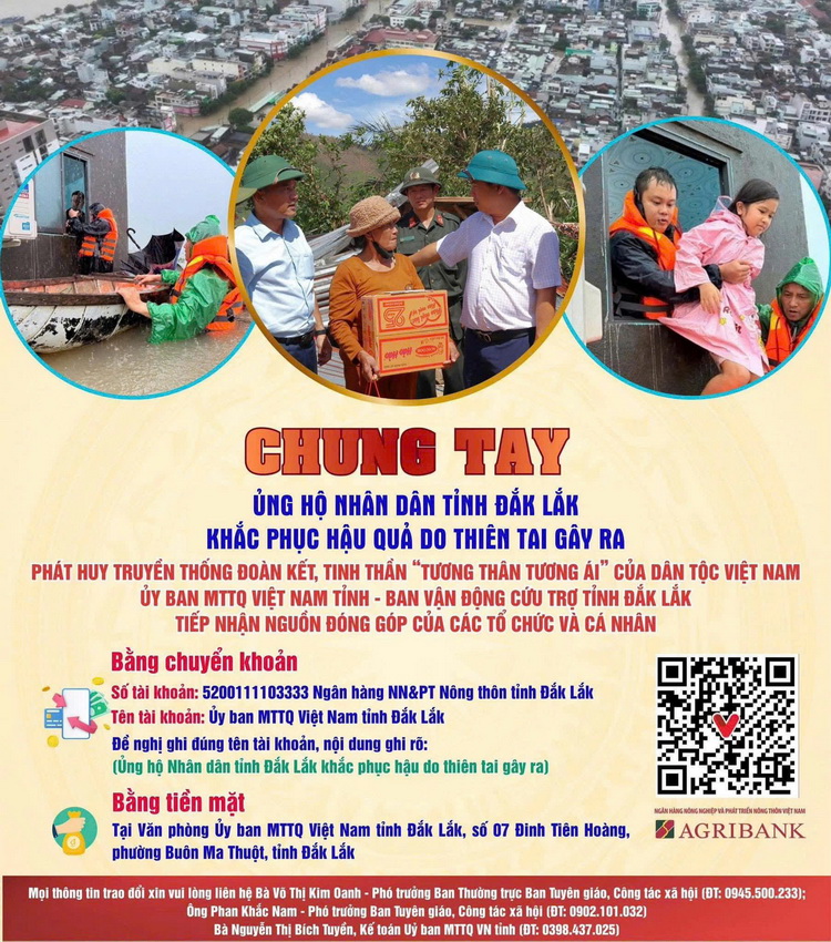 Phát huy truyền thống đoàn kết, tinh thần "tương thân, tương ái" nhằm kịp thời chia sẻ những khó khăn, mất mát với đồng bào vùng lũ, Ủy ban MTTQ Việt Nam tỉnh – Ban Vận động cứu trợ tỉnh Đắk Lắk kêu gọi các cơ quan, tổ chức, doanh nghiệp, nhà hảo tâm, các tầng lớp nhân dân trong và ngoài tỉnh quan tâm, đóng góp, hỗ trợ để giúp đỡ bà con vượt qua khó khăn, sớm ổn định cuộc sống.