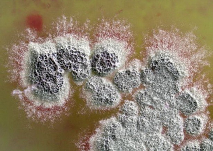 Một khuẩn lạc vi khuẩn Streptomyces coelicolor tiết ra một hợp chất kháng sinh (màu đỏ) vào môi trường xung quanh. Ảnh: Science Photo Library
