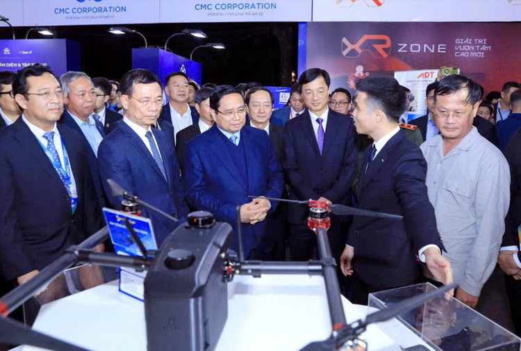 Thủ tướng Phạm Minh Chính, Bộ trưởng Bộ KH&CN Nguyễn Mạnh Hùng cùng các đại biểu tham quan, nghe giới thiệu về một sản phẩm công nghệ mới.