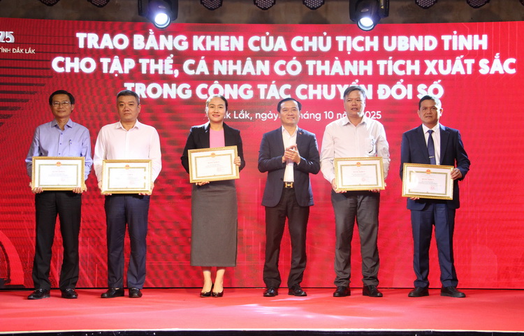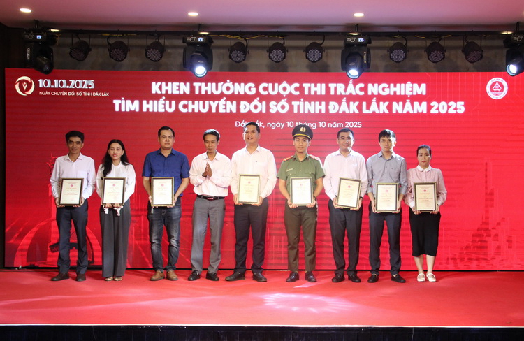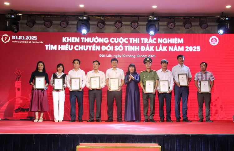 Cũng nhân dịp này, Ban tổ chức đã trao Giấy chứng nhận, khen thưởng cho tập thể, cá nhân có thành tích xuất sắc trong công tác chuyển đổi số và đạt giải trong Cuộc thi trắc nghiệm tìm hiểu về Chuyển đổi số tỉnh Đắk Lắk năm 2025. Hoạt động khen thưởng này không chỉ là sự ghi nhận xứng đáng cho những nỗ lực, sáng tạo và đóng góp tích cực của các cơ quan, đơn vị, cá nhân trong quá trình thúc đẩy chuyển đổi số trên địa bàn tỉnh, mà còn tạo động lực lan tỏa mạnh mẽ tinh thần đổi mới, học hỏi và ứng dụng công nghệ trong toàn xã hội.