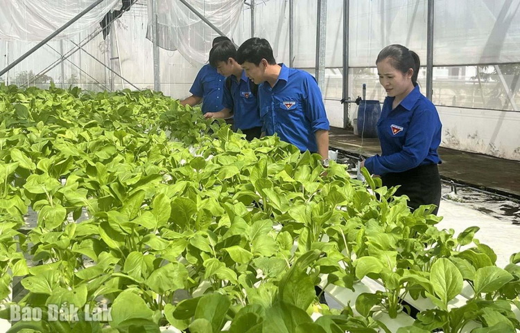Nông nghiệp công nghệ cao đang tạo ra nông sản với sản lượng, chất lượng vượt trội trên diện tích nhỏ, trong điều kiện khô hạn vì biến đổi khí hậu. Đoàn viên thanh niên xã Phú Hòa 2 tham quan mô hình trồng rau trong nhà màng tại Trung tâm Nghiên cứu và Phát triển nông nghiệp công nghệ cao Phú Yên. Ảnh: M. Duyên