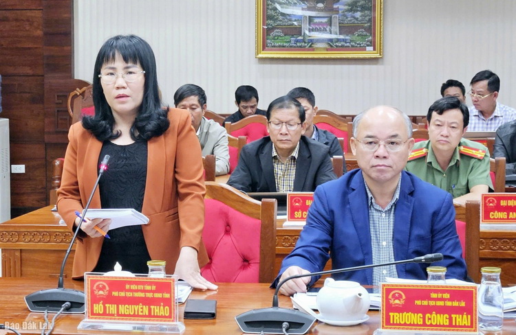 Ủy viên Ban Thường vụ Tỉnh ủy, Phó Chủ tịch Thường trực UBND tỉnh Hồ Thị Nguyên Thảo phát biểu tại hội nghị.