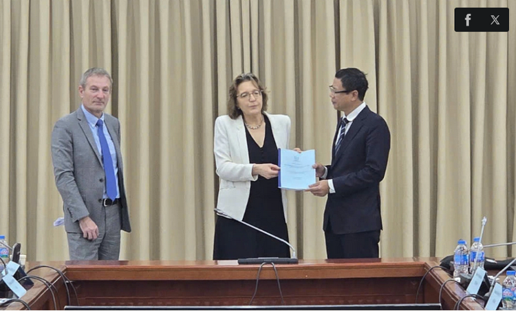 Thứ trưởng Khoa học và Công nghệ Lê Xuân Định nhận bản dự thảo báo cáo INIR sơ bộ từ bà Aline Des Cloizeaux, trưởng phòng Năng lượng hạt nhân thuộc Ban Năng lượng hạt nhân của IAEA. Ảnh: TTTT